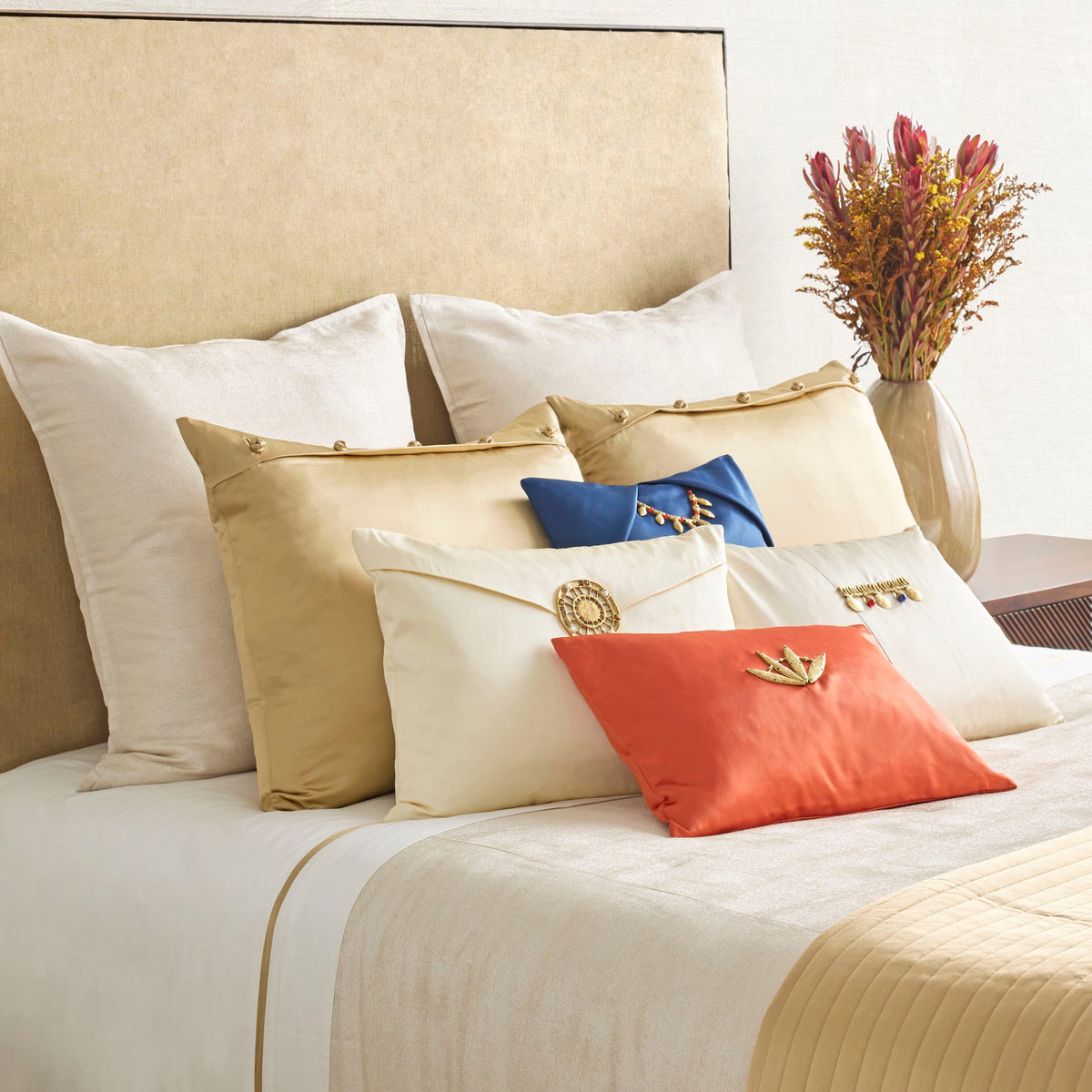 Inspired by a faience panel from Egypt's OId Kingdom period, we reimagine the shades of azure in a jacquard with embroidered lines.